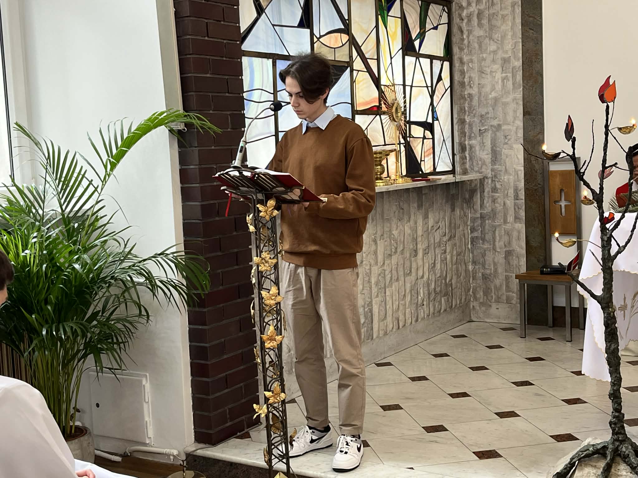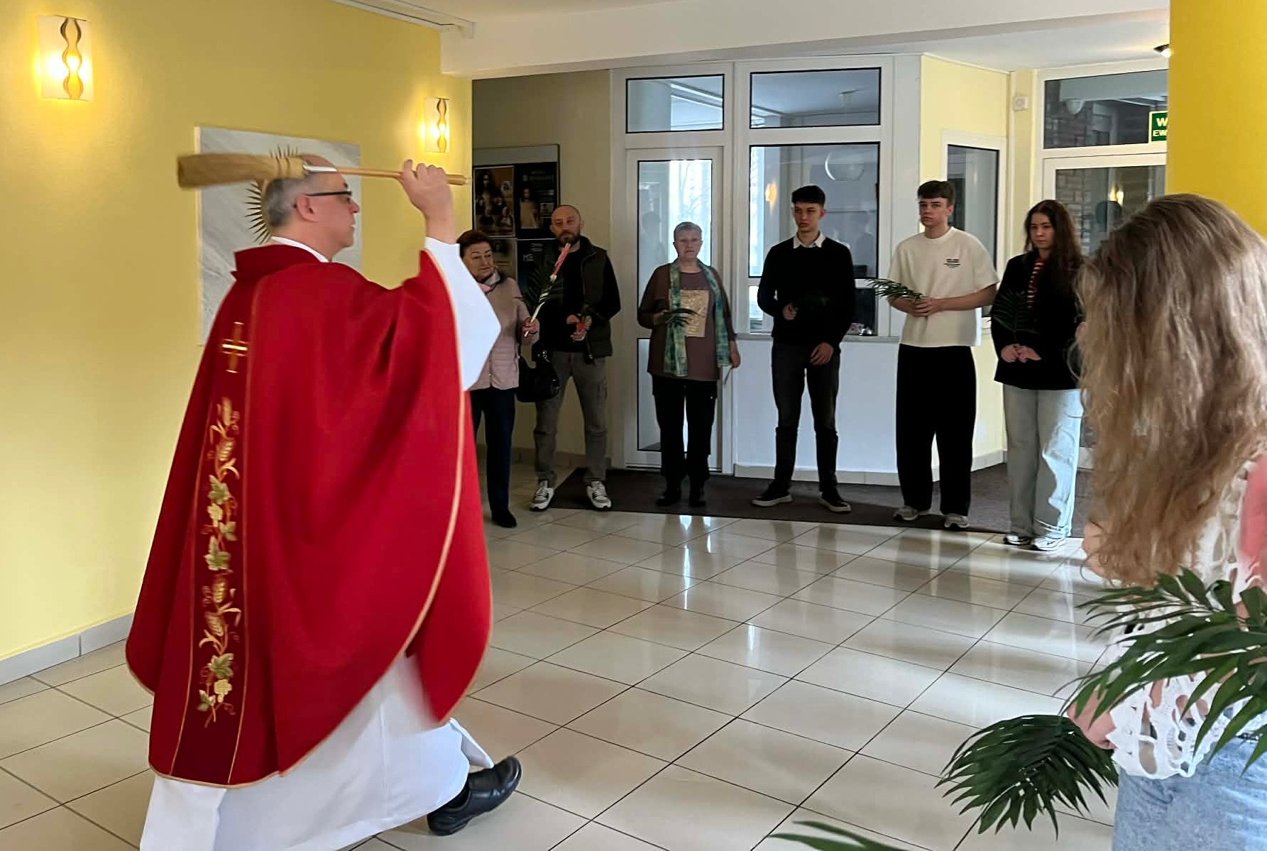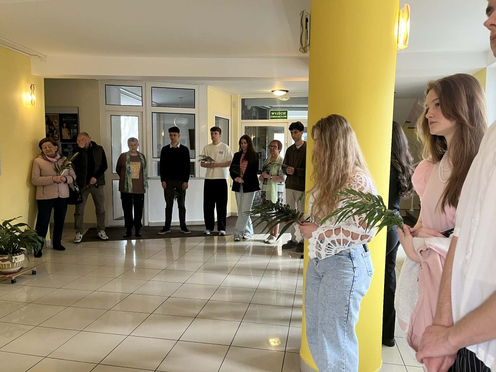 Uczestnicy uroczystości zgromadzili się w holu przed kaplicą, gdzie odbyło się poświęcenie palm oraz odczytano fragment Ewangelii opisujący uroczysty wjazd Jezusa do Jerozolimy. Procesja z palmami do kaplicy stała się symbolem naszego podążania za Chrystusem Królem, aby wraz z Nim – „przez Jego mękę i krzyż” – wejść do chwały zmartwychwstania.